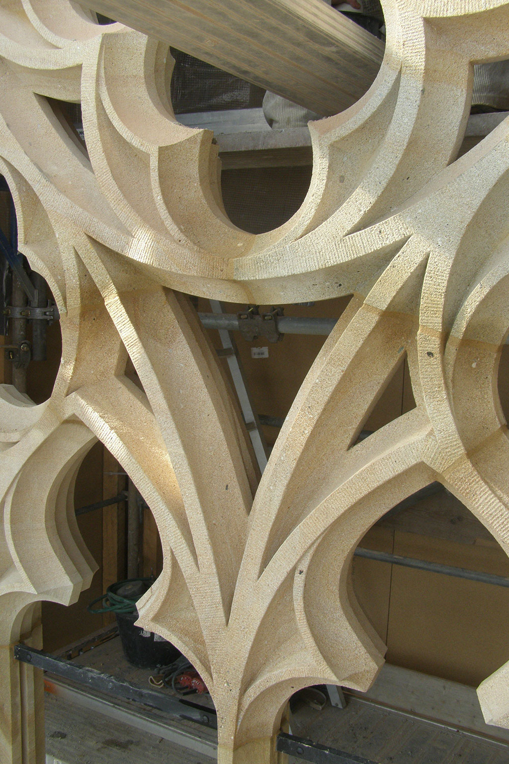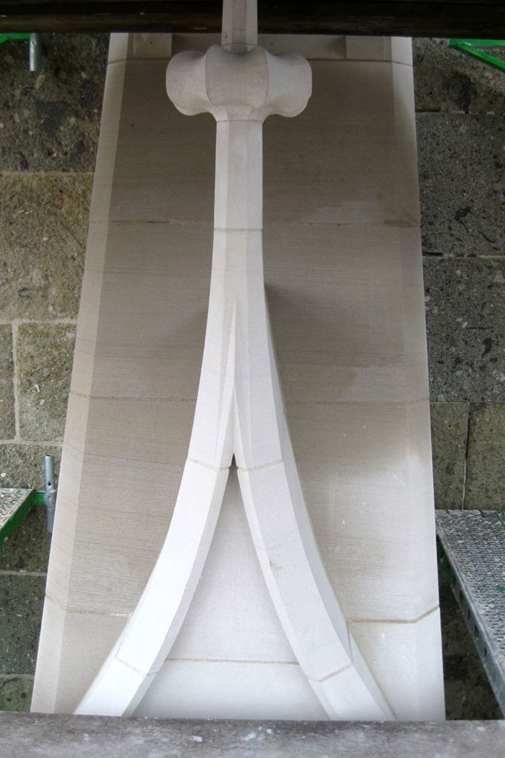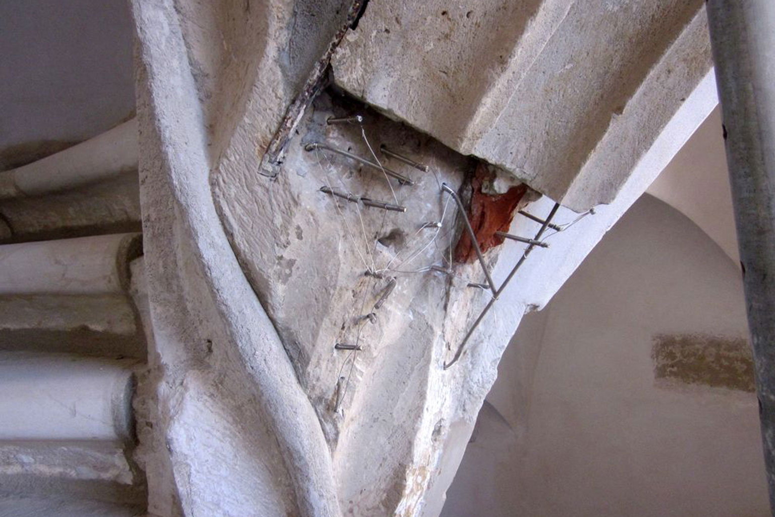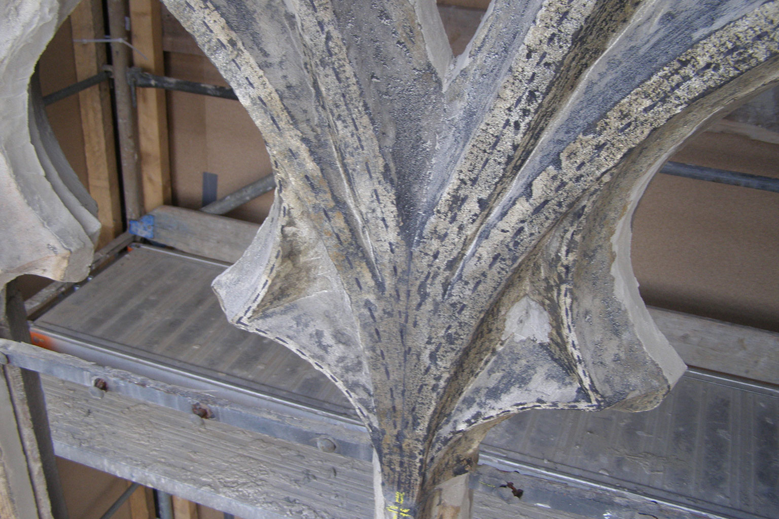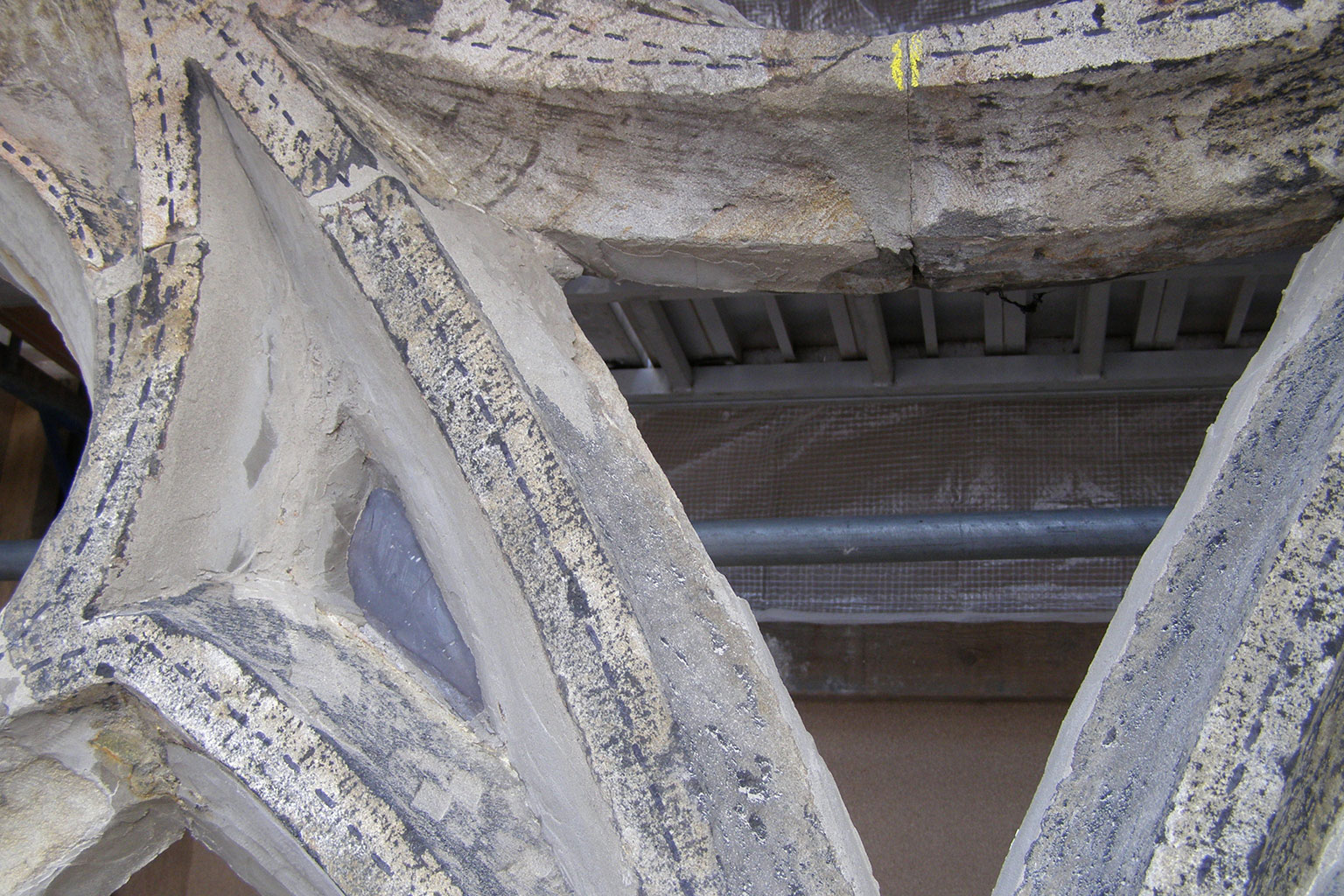 Instandsetzung der Natursteinfassade und dazugehöriger Bauteile, Massivaustausch; Naturwerksteinarbeiten-, Putzarbeiten und statische Sicherung an Strebepfeilern und Jochen, Rekonstruktion von Pfeilern