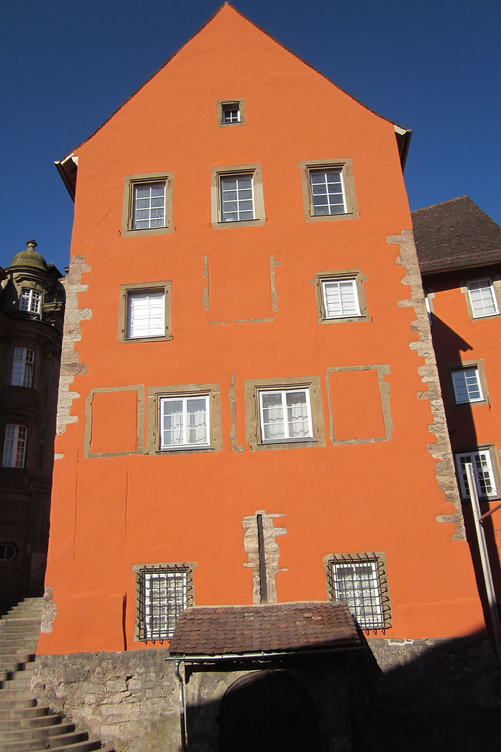 Objektbeschreibung: Das Widmanhaus (Markt 5) war Teil des 1236 gegründeten Franziskanerklosters. Im Jahr 1561 wurde das Haus im Renaissancestil umgebaut und mit einem Portal verziert, das zu den schönsten Zeugnissen dieser Epoche in Schwäbisch Hall gehört. Seit 1967 befindet sich im „Widmanhaus“ das Stadtarchiv. An beiden Gebäuden sind Fenster- und Türgewände aus grünem Schilfsandstein gefertigt. Teilweise sind noch Fassungsreste an den Gewänden zu erkennen, welche auf mehrere Fassungen schließen lassen. Die Fassadenfläche selbst ist am Markt 5 überputzt, das Nebengebäude wurde steinsichtig belassen.